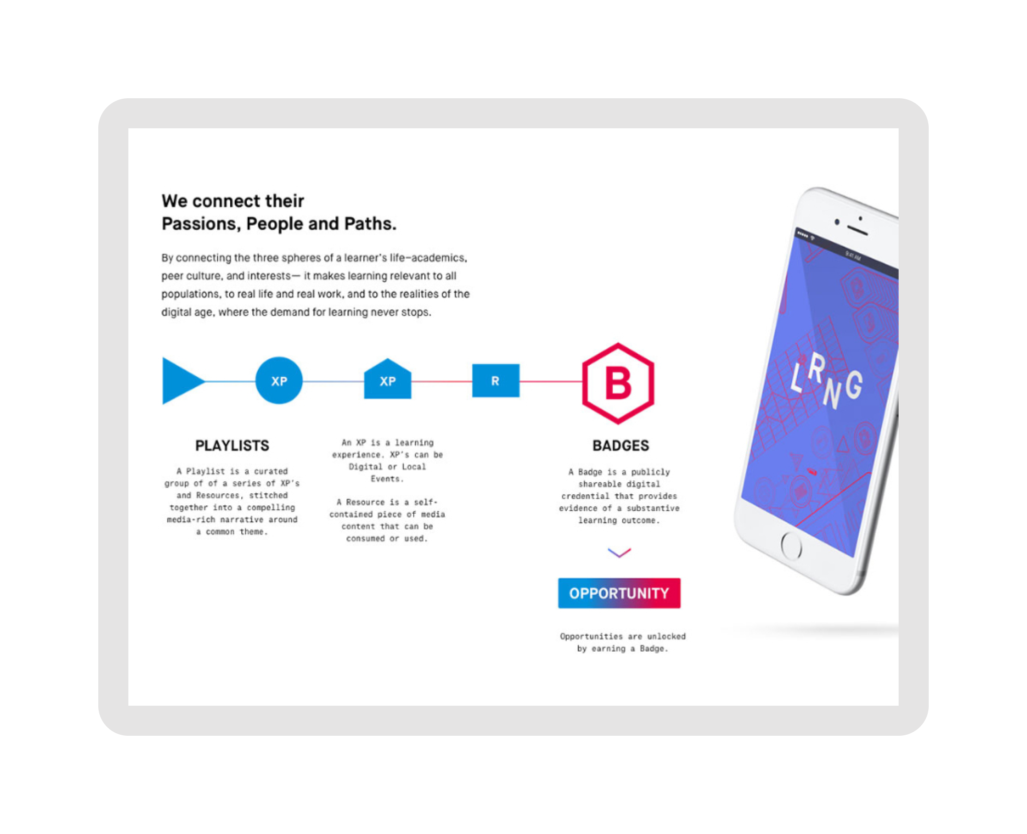 LRNG is a social enterprise that aims to transform how young people access and experience learning, especially those from underserved communities. Our aim was to develop and design a connected and scaleable technical infrastructure that would empower cities to easily curate, connect, and monitor an ecosystem of “experiences where learning happens” within their communities.